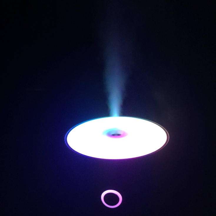 USBケーブル等をセットして、前面のボタンを押下。おーっ、上面部がレインボー色に光り蒸気が発生してきました。これはまさにゲーミング仕様ですなw。