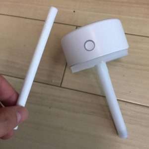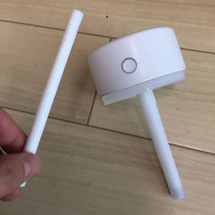 交換用の棒フィルター。自分はメインの加湿器はスチーム式(お湯を沸かして蒸気を発生させる方式)を使用しているので、衛生面は非常に安全なのですが、この加湿器はおそらく超音波式(水を超音波で振動させて気化する方式)だと思われるので、雑菌やカビが繁殖しないようこまめなお手入れや水換えが必要だと思われます。