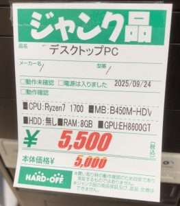 ハードオフにて、お得そうなジャンクPCを発見。値段は5500円とジャンク品にしては微妙な値段ですが、