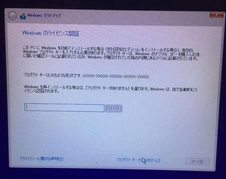 おそらく前オーナーもWindows10を使用していたと思われるので、デジタルライセンスキーを試すため、ここでのプロダクトキーはあえて”プロダクトキーがありません”を選択してインストール続行。