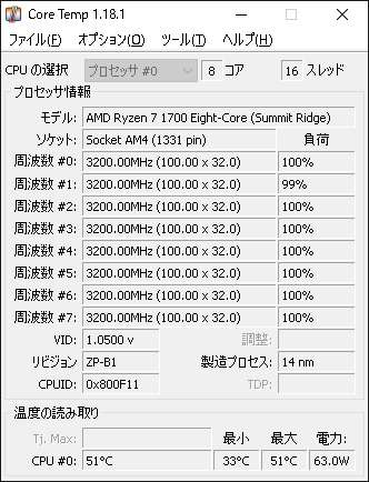 ちなみに高負荷時のCPUの最高温度は51℃でした。さすがの水冷式ファンですね。