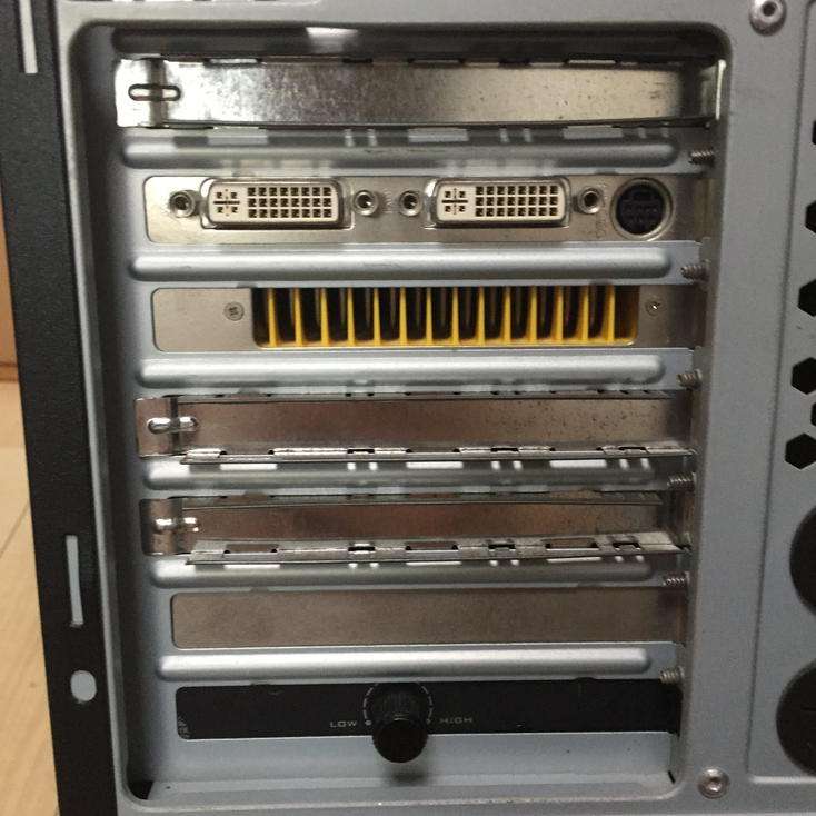おそらく、前オーナーがこの本体を売りに来る時に使用していたグラボを取り外し適当に家に余っていたグラボにでも差し替えたのではないかと思われます。