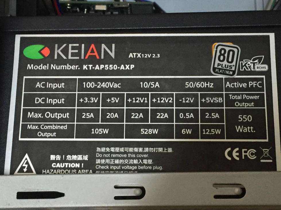 電源は恵安(KEIAN)の550Wモデル。Platinum認定シールが貼られていますが、斜めになっていてちょっと怪しいw