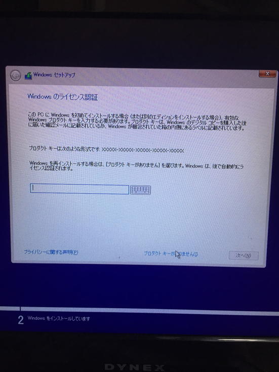 おそらく前オーナーもWindows10を使用していたと思われるので、デジタルライセンスキーを試すため、ここでのプロダクトキーはあえて”プロダクトキーがありません”を選択してインストール続行。