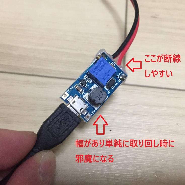 単純にこの昇圧コンバータの回路部分が出っ張っているため取り回しする際に邪魔になるのです。またケーブルの接続部分は普段テープなどで保護しているのですが、経年劣化等で断線しやすくなる可能性があります。