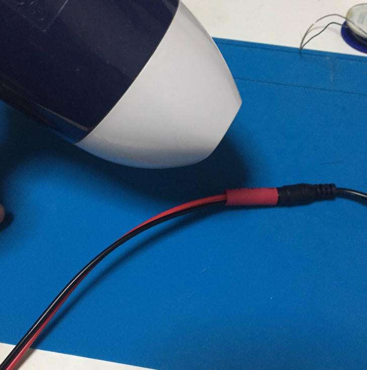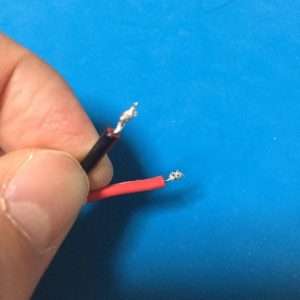 そして黒い側のケーブル(負極側)の先端部分をUSB9V昇圧ケーブルのプラグの正極側に挿し込みます。(正極と負極を反転させるため)先ほどハンダを盛っていたのは厚みを出してこのケーブルを抜けにくくする&内部で接触を良くするためだったのです。