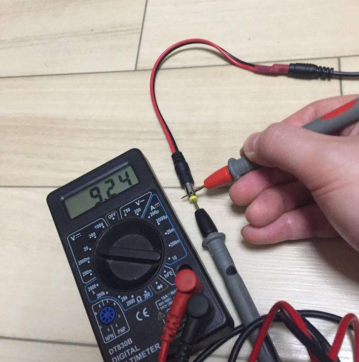 完成後テスターでチェック。ちゃんとセンターマイナス仕様に極性変更出来ており、電圧は約9.2V程出ています。バッチリですね。