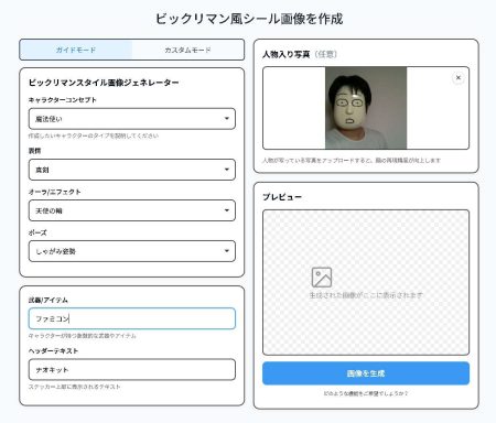 この際、右上の項目に顔写真やイラスト等をアップしておくと、生成されるキャラにその画像が反映されます。