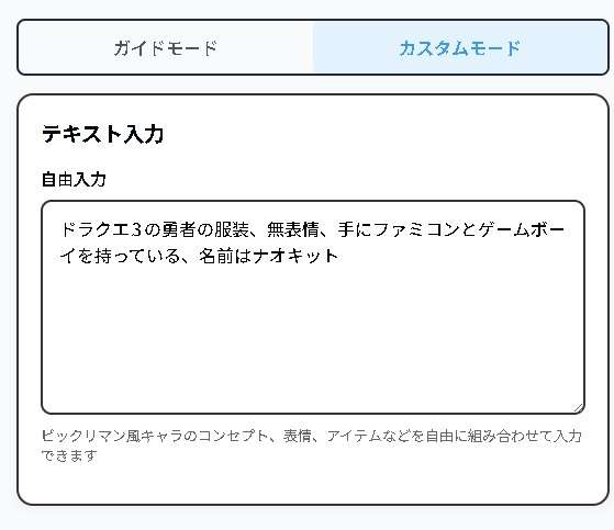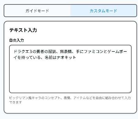 生成されるキャラ属性に、より詳細な指示をAIに与えたい場合は”カスタムモード”を使用します。自分は今回このモードを使用してみましょう。これは面白そう!