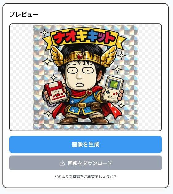 このサービスはAIを利用し、1990年代に大ヒットした”ビックリマンシール(悪魔VS天使シール編)”のデザイン風キャラを作成してくれるジェネレーターです。